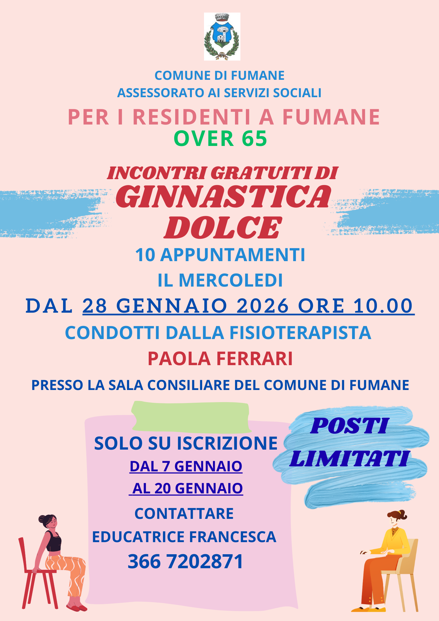 Il Comune di Fumane - Assessorato ai Servizi Sociali, propone per i residenti over 65 dieci incontri gratuiti di ginnastica dolce, con la fisioterapista, dal 28 gennaio alle ore 10.00 presso la sala consiliare.
